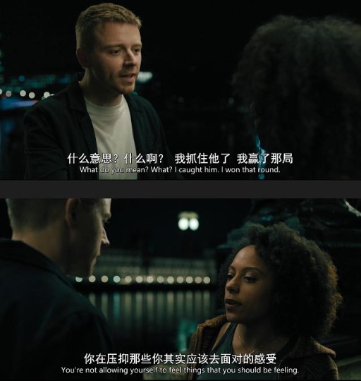从对话来看,两人对于“男子气概”(masculinity)的认知是不同的。River认为“男子气概被击碎”的意思是“被打败”,所以他更正“自己实际上是赢了的”。而Louisa认为“被击碎”的是他原先正常的状态(可以参考第三季第四集结尾他俩在车里等人时River激怒Louisa之后他的反应,那是心理和情绪健康的典型案例),现在因为父亲Frank的存在和偷袭而应激,变成了想要打败他的“超级战士”。“赢”成了River的执念,相应地,“赢不了”的担忧成了他不安全感和火药味的来源。