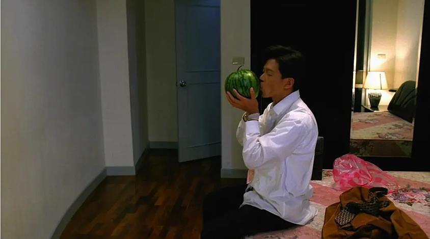 人们常把蔡明亮视为安东尼奥尼(“不可沟通性”主题的代名词)的继承者,但我们也不应忽视他与卓别林及雅克·塔蒂之间更为深刻的联系:他们重新发明了“姿势”(geste)——即使是在最彻底的绝望中,它也寄居于幽默的一隅。另外更重要的是,他们对情感荒唐的四散漫溢怀有一种无度的偏爱。只要看看李康生在《爱情万岁》中,用一颗西瓜自创保龄球游戏,或穿着裙子与高跟鞋在地上翻滚,就能明白这一点。这些姿势脱离了顽钝现实的轨道:身体拒绝溶解于背景之中,这些姿势便是它发出的呐喊。